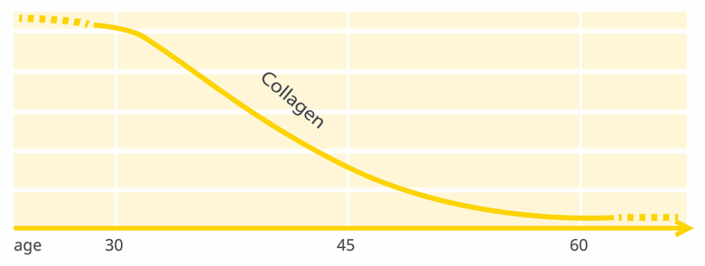 (圖片1) 膠原蛋白在青春期後達到高峰,隨著年齡逐漸減少。這種變化與肌膚彈性下降、細紋與鬆弛的出現有關,因此常被視為肌膚老化的重要因素之一。