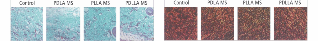 切片結果發現,聚左旋乳酸具有更良好的膠原蛋白增生能力,且比聚雙旋乳酸長出的膠原更加緻密。