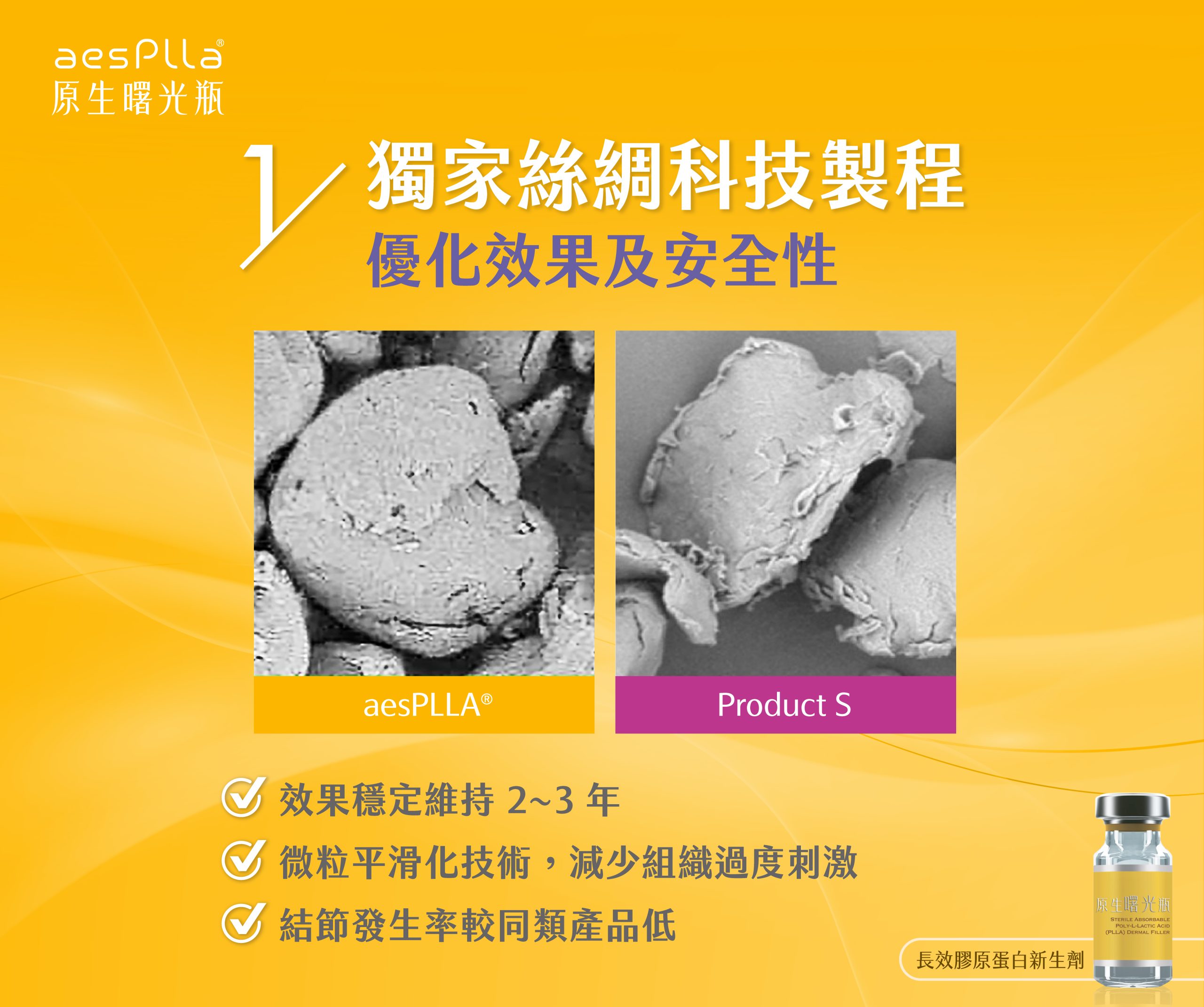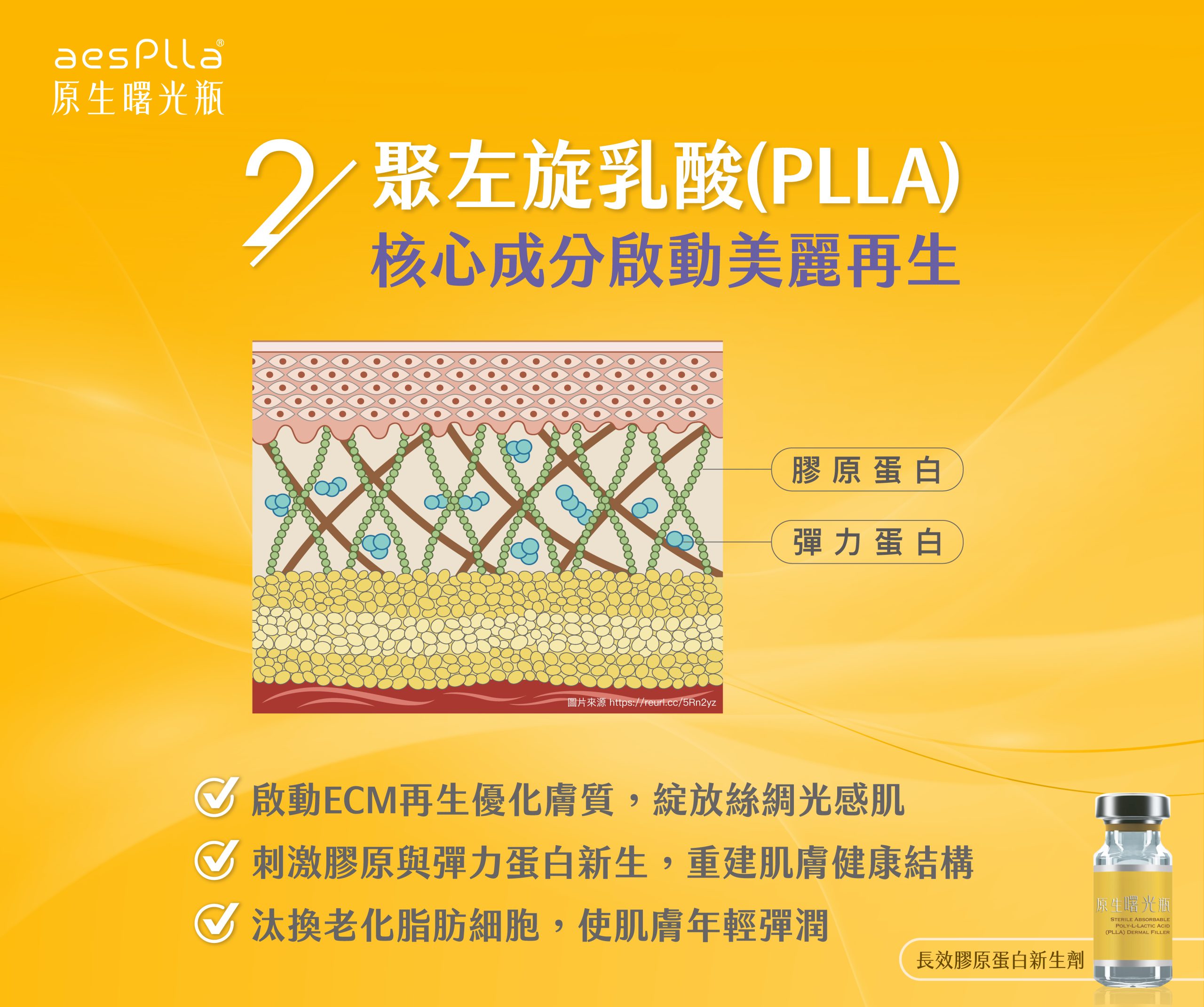 原生曙光瓶是一款來自韓國的注射型醫療產品,主要成分為聚左旋乳酸(PLLA, Poly-L-Lactic Acid)。PLLA 微粒具高生物相容性,能被人體自然吸收。不同於玻尿酸等立即填充劑,原生曙光瓶採用漸進式微粒釋放設計,呈現自然材質特性與長效特性,廣受醫美專業人士歡迎。
