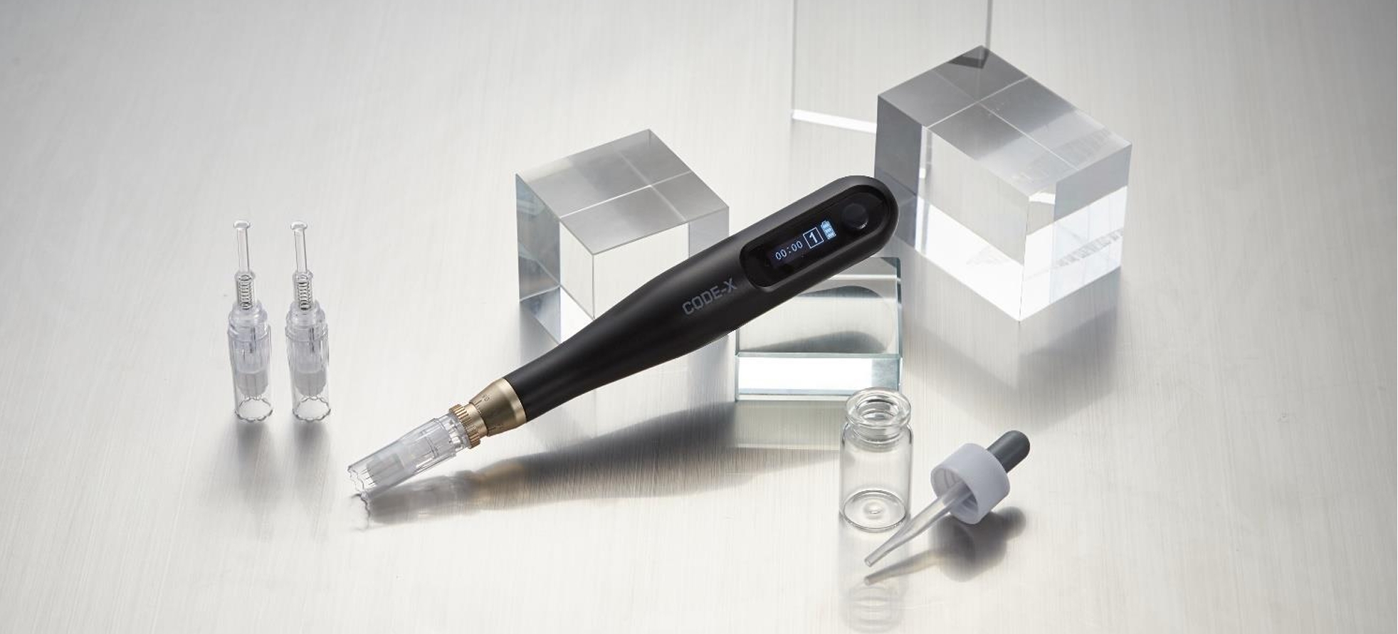 CODE-X肌活筆透過細微針頭,在肌膚表層製造無數個微創通道,啟動修復機制,改善膚質紋理、淡化疤痕與皺紋,亦可強化保養成分的深層導入。