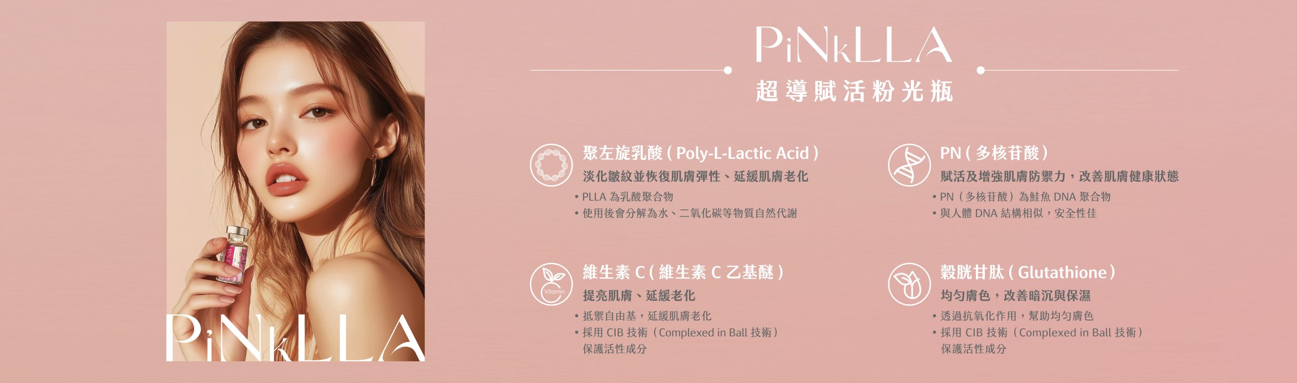 專業護膚科技的奢華肌因精萃,PiNkLLA 超導賦活粉光瓶以聚左旋乳酸(LLA)與多核苷酸(PN)為核心成分,搭配維生素C(Vitamin C)與穀胱甘肽(Glutathione);關鍵四重養膚能量,為肌膚注入潤澤光采,展現細緻、柔嫩的健康膚況